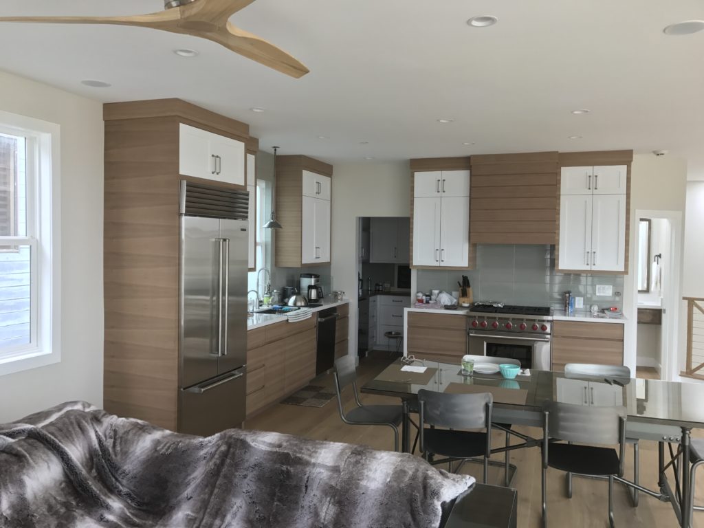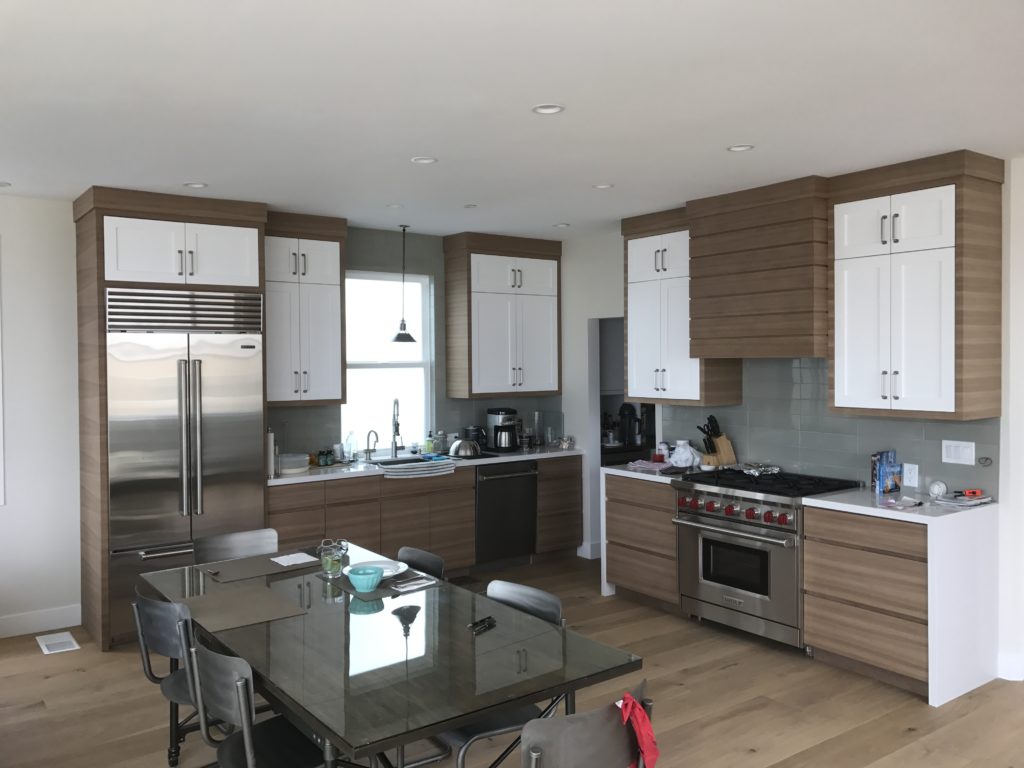Rift Walnut Slab Style Base Cabinets w/Painted White Shaker Upper Doors